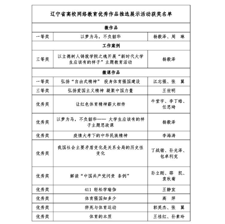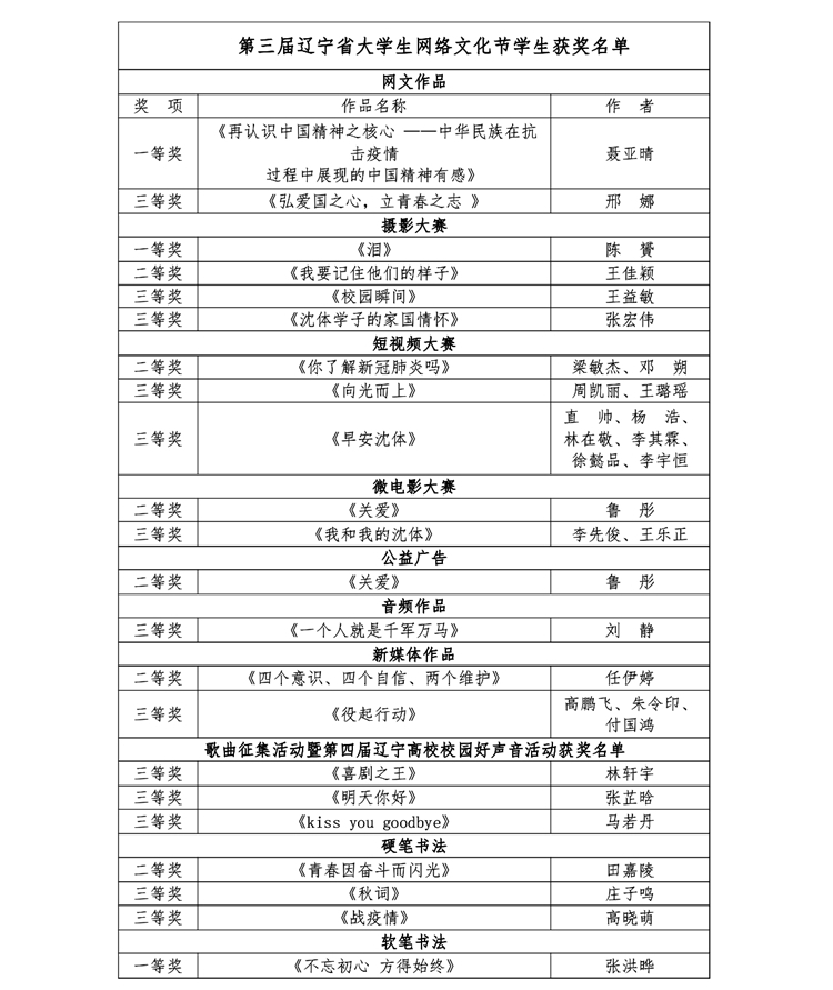近日,辽宁省委宣传部、省委网信办、省委教育工委、省教育厅2020年联合举办的第三届辽宁省大完美网址网络文化节和全省高校网络教育优秀作品推选展示活动评选结果揭晓。本次活动中,我校共35项作品获奖,其中一等奖5项,二等奖6项,三等奖15项,优秀奖9项,立博体育,辽宁体育台荣获“辽宁省优秀易班工作站”,“遇见沈体”系列活动荣获辽宁省优秀易班共建案例,党委完美网址工作部周琳荣获辽宁省“优秀易班指导教师”称号。